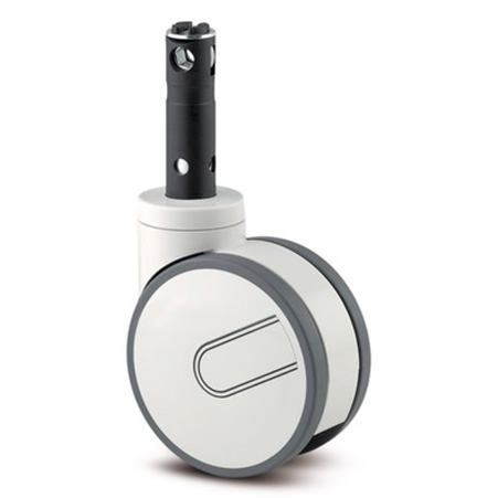 Rueda giratoria con freno central, total y direccional,soporte de chapa de acero, rodamiento de bolas a precisión en cabeza giratoria, con cubierta sintética, espiga con agujero de barras perfiladas hexagonales. Núcleo de rueda de poliamida, bandaje de poliuretano, cojinete de bolas de precisión.