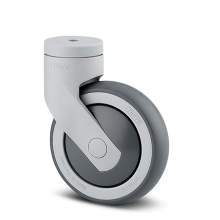 Soporte y ruedas fabricados con materiales sintéticos de alta calidad, rodamiento giratorio de dos hileras de bolas, pletina de fijación, Núcleo de rueda de polipropileno, bandaje TENTEprene (goma termostatica), gris,nodeja huella, con placas anti´hilos, cojinete de precisión.